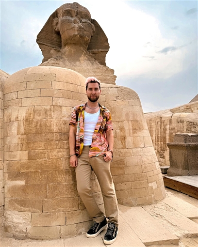 لانس باسونشر لانس باس صورا له من أمام تمثال أبو الهول وبداخل خان الخليلي.