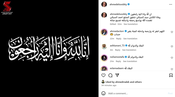 وكتبت صفحة المنتج أحمد السبكي الرسمية عبر موقع التواصل الاجتماعي إنستجرام: "ان لله وانا اليه راجعون. وفاة الكابتن سيد السبكي شقيق المنتج احمد السبكي. تغمده الله بواسع رحمته واسكنه فسيح جناته".