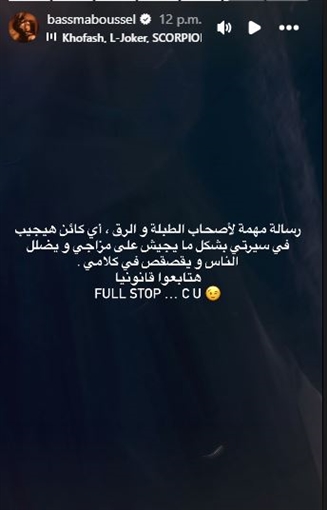 كتبت بسمة بوسيل عبر حسابها بتطبيق Instagram: "رسالة مهمة لأصحاب الطبلة والرق، أي كائن هجيب في سيرتي بشكل مايجيش على مزاجي ويضلل الناس ويقصقص من كلامي، هتابعوا قانونيا، نقطة وآراكم".