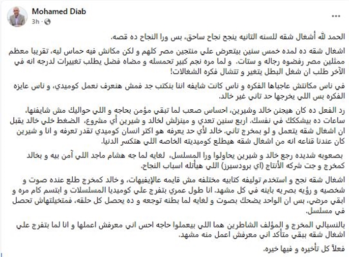 كتب محمد دياب عبر حسابه بموقع Facebook: "الحمد لله أشغال شقه للسنه التانيه ينجح نجاح ساحق، بس ورا النجاح ده قصه.