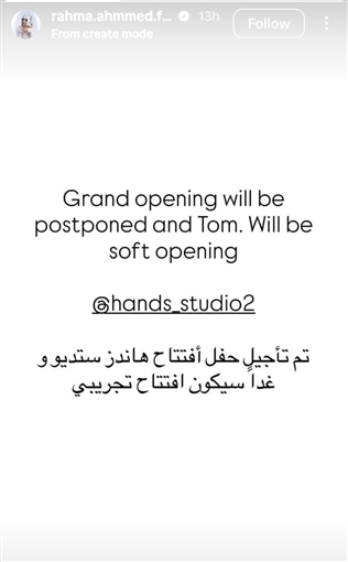 لكن بسبب تعرضها لوعكة صحية أعلنت تأجيل الافتتاح وكتبت عبر خاصية القصص القصيرة في حسابها على Instagram: "تم تأجيل حفل افتتاح هاندز ستديو وغدا سيكون افتتاح تجريبي".