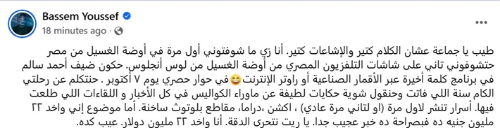 وتابع باسم يوسف: "هنتكلم عن رحلتي الكام سنة اللي فاتت وهنقول شوية حكايات لطيفة عن ماوراء الكواليس في كل الأخبار واللقاءات اللي طلعت فيها. أسرار تنشر لأول مرة (أو لتاني مرة عادي)، أكشن، دراما، مقاطع بلوتوث ساخنة. أما موضوع إني واخد 22 مليون جنيه ده بصراحة ده خبر عجيب جدا. يا ريت نتحرى الدقة أنا واخد 22 مليون دولار. عيب كده".