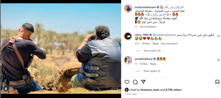 وكتب محمد إمام معلقا على الصورة عبر حسابه بتطبيق Instagram: "توكلنا على الله، لقاء النجوم، حرب الجبابرة، معركة الوحوش، (صقر وكناريا)، أقوى مفاجأة سينمائية إن شاء الله، قريباً .. بس مش اوي".