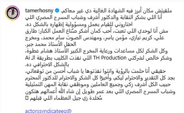 ونشر تامر حسني بيان النقابة عبر حسابه على Instagram وحرص على توجيه الشكل لكل من شارك في الحفل وشارك في الأغنية التي قدمها وظهر فيها عدد من نجوم مصر بالذكاء الاصطناعي.