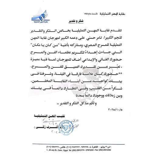 بيان نقابة المهن التمثيليةوكتب تامر حسني: "ملقيتش مكان أبرز فيه الشهادة الغالية دي غير معاكم. أنا اللي بشكر النقابة والدكتور أشرف وشباب المسرح المصري اللي اختاروني للقيام بعمل ومسؤولية إظهاره بالشكل ده".