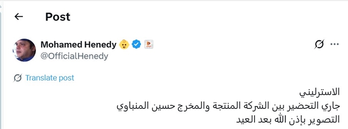 وكشف محمد هنيدي عن موعد البدء في تصوير فيلم "الإسترليني"، وكتب عبر حسابه على موقع X: "الإسترليني جاري التحضير بين الشركة المنتجة والمخرج حسين المنباوي التصوير بإذن الله بعد العيد".