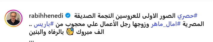 ونشر ربيع هنيدي صور آمال ماهر وزوجها عبر صفحته الرسمية في موقع التواصل الاجتماعي إنستجرام، وكتب في التعليق: "حصري الصور الأولى للعروسين النجمة الصديقة المصرية آمال ماهر، وزوجها رجل الأعمال علي محجوب من باريس. ألف مبروك بالرفاه والبنين".