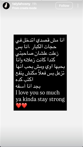 كتبت تاليا: "أنا مش قصدي أتدخل في حاجات الكبار، أنا بس زعلت علشان صاحبتي كندا كانت زعلانه، وأنا بحبها أوي ومش بحب إنها تزعل، بس فعلًا مكانش ينفع أكتب كده، بجد أنا آسفة".