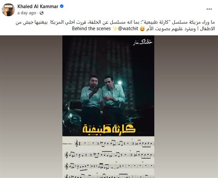 كتب خالد الكمار عبر حسابه بموقع Facebook: "ما وراء مزيكة مسلسل (كارثة طبيعية)، بما انه مسلسل عن الخلفة، قررت اخلي المزيكا بيغنيها جيش من الاطفال ! وبيترد عليهم بصويت الأم".
