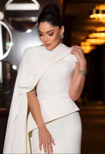 ندى موسى بفستان أبيض في معرض "أنا عربية" من تصميم أيمن لحمونيجمع الفستان بين الفخامة والرقي، فجاء الوشاح على جانب واحد طويلا يلامس الأرض، وبتصميم كورسيه مميز وتنورة ضيقة.