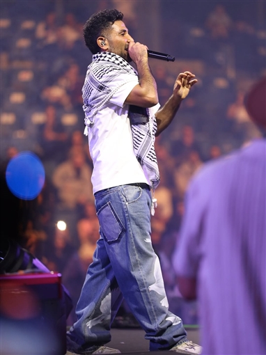 تألق النجمان بإطلالة كاجوال شبابية في الحفل، وظهر أحمد سعد بالكوفية الفلسطينية، وسط تفاعل كبير من الجمهور.