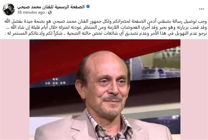 ونقل المسئول عن صفحته الرسمية على Facebook رسالة محمد صبحي وقال: "وجب توصيل رسالة بصفتي أدمن الصفحة لحضراتكم ولكل جمهور الفنان محمد صبحي هو بصحة جيدة بفضل الله وقد قمت بزيارته وهو بخير وقد أجري الفحوصات اللازمة".