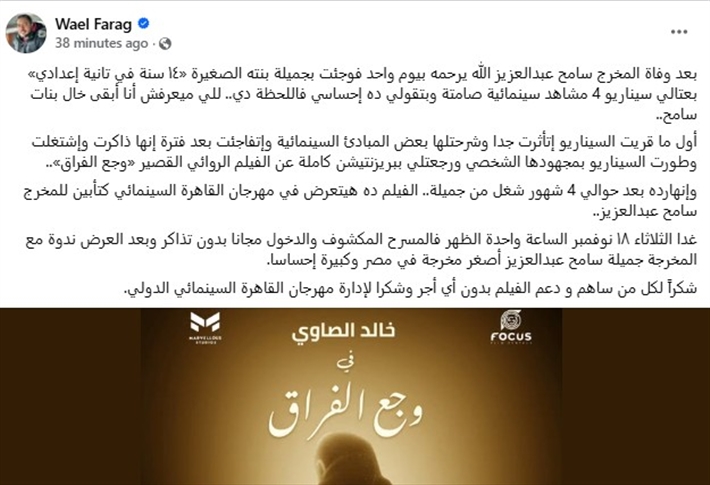 وكتب وائل فرج عبر حسابه على Facebook: "بعد وفاة المخرج سامح عبدالعزيز الله يرحمه بيوم واحد فوجئت بجميلة بنته الصغيرة «14 سنة في تانية إعدادي» بعتالي سيناريو 4 مشاهد سينمائية صامتة وبتقولي ده إحساسي فاللحظة دي.. للي ميعرفش أنا أبقى خال بنات سامح".