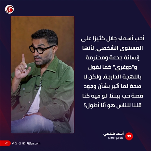 وقال فهمي، خلال إستضافته في برنامج Mirror، الذي يقدمه الإعلامي خالد فرج: أحب أسماء جلال كثيرًا على المستوى الشخصي، لأنها إنسانة جدعة ومحترمة و"دوغري" كما نقول باللهجة الدارجة، ولكن لا صحة لما أثير بشأن وجود قصة حب بيننا، "لو فيه كنا قلنا للناس.. هو أنا أطول؟"