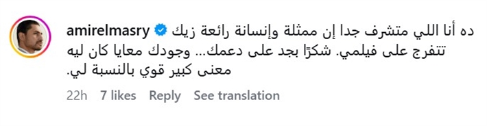 تعليق إلهام شاهين ومن جانبه رد أمير المصري عليها معبرا عن سعادته بما قالته عن وكتب لها: "ده أنا اللي متشرف جدا إن ممثلة وإنسانة رائعة زيك تتفرج على فيلمي. شكرا بجد على دعمك… وجودك معايا كان ليه معنى كبير قوي بالنسبة لي".