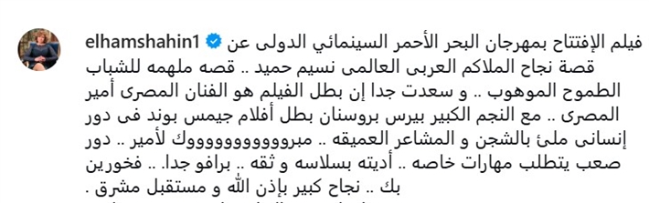 ونشرت إلهام شاهين صورها مع أمير المصري عبر حسابها على Instagram وكتبت: " فيلم الافتتاح بمهرجان البحر الأحمر السينمائي الدولي عن قصة نجاح الملاكم العربي العالمي نسيم حميد، قصة ملهمة للشباب الطموح الموهوب، وسعدت جدا إن بطل الفيلم هو الفنان المصري أمير المصري مع النجم الكبير بيرس بروسنان بطل أفلام جيمس بوند فى دور إنساني ملئ بالشجن والمشاعر العميقة، مبروك لأمير، دور صعب يتطلب مهارات خاصة أديته بسلاسة وثقة برافو جدا فخورين بك نجاح كبير بإذن الله ومستقبل مشرق".