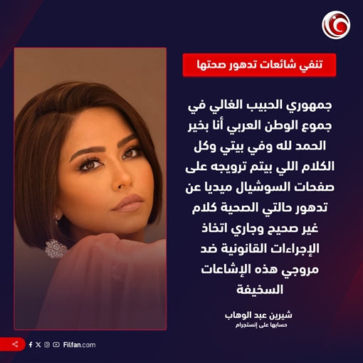 وقالت شيرين عبد الوهاب: "جمهوري الحبيب الغالي في جموع الوطن العربي أنا بخير الحمد لله وفي بيتي وكل الكلام اللي بيتم ترويجه على صفحات السوشيال ميديا عن تدهور حالتي الصحية كلام غير صحيح وجاري اتخاذ الإجراءات القانونية ضد مروجي هذه الإشاعات السخيفة".