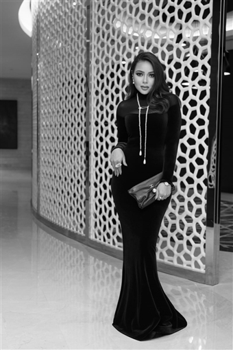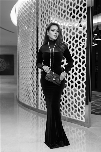 اختارت أسما فستاناً أسود طويلاً من Elisabetta Franchi بقصّة ضيّقة تحتضن القوام وتنسدل بامتدادٍ انسيابي حتى الأرض، مع ياقة شفافة عالية تضيف لمسة نعومة ورقي إلى التصميم المخملي الفاخر.