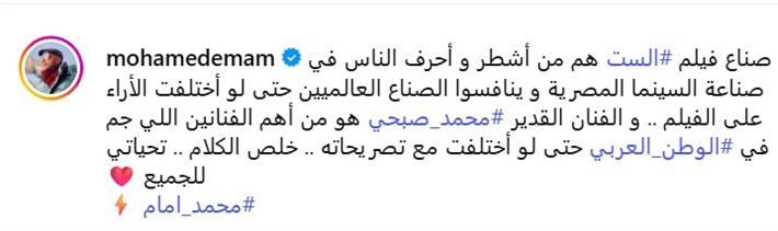 ونشر محمد إمام عبر حسابه على Instagram صورة لمحمد صبحي وصورة لبوستر فيلم "الست" وكتب: "صناع فيلم الست هم من أشطر وأحرف الناس في صناعة السينما المصرية وينافسوا الصناع العالميين حتى لو اختلفت الأراء على الفيلم .. والفنان القدير محمد صبحي هو من أهم الفنانين اللي جم في الوطن العربي حتى لو اختلفت مع تصريحاته .. خلص الكلام .. تحياتي للجميع".