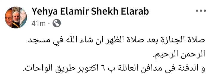 وأعلن شقيقه يحيى عن موعد ومكان الجنازة وكتب: "صلاة الجنازة بعد صلاة الظهر إن شاء الله في مسجد الرحمن الرحيم، والدفنة في مدافن العائلة بـ6 أكتوبر طريق الواحات".