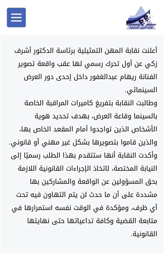 وطالبت النقابة بتفريغ كاميرات المراقبة الخاصة بالسينما وقاعة العرض، بهدف تحديد هوية الأشخاص الذين تواجدوا أمام المقعد الخاص بها، والذين قاموا بتصويرها بشكل غير مهني أو قانوني.