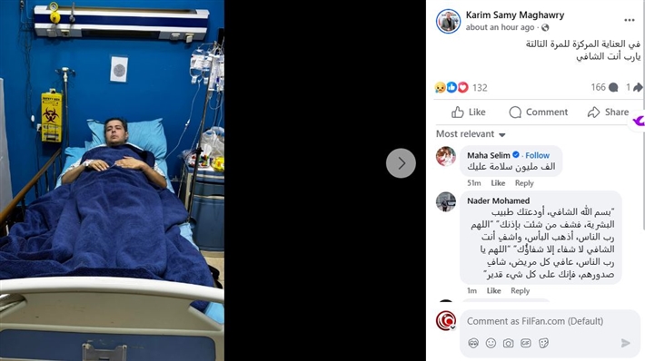 ونشر كريم سامي مغاوري صورة له على فراش المرض، وعلق عبر صفحته الرسمية بموقع Facebook: "في العناية المركزة للمرة التالتة، يارب أنت الشافي".