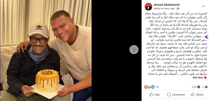 واختتم أحمد عبد الحميد منشوره كاتبا: بس أنا عارف ان كل ده ولا يشغلك دلوقتى يا عم وانت منعم فى جنة الرحمن مع حبايبك كلهم وهو ده عزائى الوحيد، ربنا يرحمك يا أطيب قلب و احسن أب ويجعلنى خير خلف ليك وأفضل محافظ على اسمك وسيرتك وأخلاقك اللى سايبها فى قلوب الناس … أشوفك على خير يا حمادة".