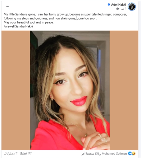 ونشر عادل حقي صورة لابنته وعلق كاتبا: "“ابنتي الصغيرة ساندرا رحلت، رأيتُها تولد، تكبر، تصبح مغنية وملحنة موهوبة جدًا، تسير على خطاي وتتبع توجيهاتي… والآن رحلت، رحلت مبكرًا جدًا. لتسترح روحك الجميلة بسلام. وداعًا ساندرا حقي".