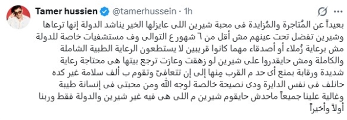 وكتب تامر حسين عبر حسابه بموقع X: "بعيداً عن المُتاجرة والمُزايدة فى محبة شيرين اللى عايزلها الخير يناشد الدولة إنها ترعاها وشيرين تفضل تحت عينهم مش أقل من 6 شهور على التوالى وفي مستشفيات خاصة للدولة مش برعاية زُملاء أو أصدقاء مهما كانوا قريبين لا يستطعون الرعاية الطبية الشاملة والكاملة".