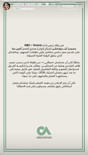 وجاء في البيان: "في إطار حرص إدارة MBC / Shahid وسیدرز آرت برودكشن ( صباح إخوان ) ومخرج العمل أمين درة على تقديم عمل درامي متكامل يلبي تطلعات الجمهور، وبالشكل الذي يحقق الرؤية الفنية المرجوة، ونظرًا إلى أن مسلسل «ممكن» من بطولة نادين نسيب نجيم ظافر العابدين ونخبة من الممثلين، يتطلّب فترة إنتاجية أطول لاستكمال التصوير وكافة التفاصيل الفنية، تقرر تأجيل عرضه إلى ما بعد شهر رمضان المبارك 2026، حرصًا على الجودة التي يستحقها العمل والجمهور على حد سواء".