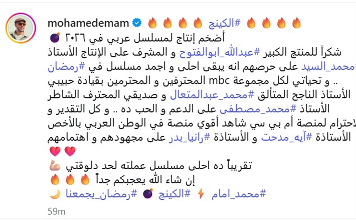 ونشر محمد إمام صورته من كواليس التصوير عبر حسابه على Instagram وكتب: "الكينج أضخم إنتاج لمسلسل عربي في 2026 شكراً للمنتج الكبير عبدالله أبو الفتوح والمشرف على الإنتاج الأستاذ محمد السيد على حرصهم أنه يبقى أحلى وأجمد مسلسل في رمضان .. وتحياتي لكل مجموعة mbc المحترفين والمحترمين بقيادة حبيبي الأستاذ الناجح المتألق محمد عبد المتعال وصديقي المحترف الشاطر الأستاذ محمد مصطفى على الدعم والحب ده .. وكل التقدير والاحترام لمنصة أم بي سي شاهد على مجهودهم و اهتمامهم، تقريبا ده أحلى مسلسل عملته لحد دلوقتي إن شاء الله يعجبكم جدا".