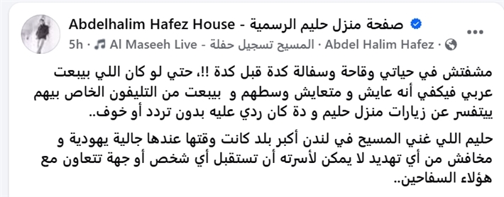 بيان أسرة عبد الحليم حافظحليم اللي غنى المسيح في لندن أكبر بلد كانت وقتها عندها جالية يهودية ومخافش من أي تهديد لا يمكن لأسرته أن تستقبل أي شخص أو جهة تتعاون مع هؤلاء السفاحين".