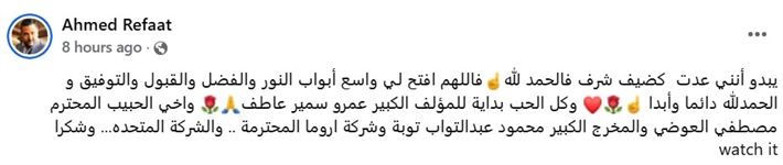 ونشر أحمد رفعت بوستر شخصيته في المسلسل عبر حسابه على Facebook وكتب: "يبدو أنني عدت كضيف شرف فالحمد لله فاللهم افتح لي واسع أبواب النور والفضل والقبول والتوفيق و الحمدلله دائما وأبدا وكل الحب بداية للمؤلف الكبير عمرو سمير عاطف واخي الحبيب المحترم مصطفي العوضي والمخرج الكبير محمود عبدالتواب توبة وشركة اروما المحترمة .. والشركة المتحدة... وشكرا ".watch it