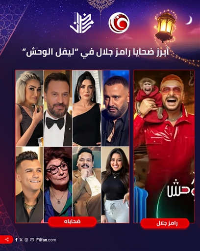 علم FilFan.com من مصادر خاصة أسماء عدد من النجوم الذين وقعوا ضحايا لبرنامج رامز جلال هذا العام (ليفل الوحش) ومنهم: أحمد السقا، وغادة عادل، وغادة عبد الرازق، وسماح أنور، وماجد المصري، ومصطفى غريب، ورحمة أحمد، والمطرب الشعبي عصام صاصا.