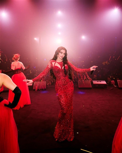 هيفاء وهبياعتمد شربل زوي لونا أحمر غنيا ومشبّعا، يرمز إلى الحب والشغف، لكنه قدّمه بقالب بصري متكامل، بحيث بدا الفستان امتدادا طبيعيا لهوية المناسبة. وقد ساهمت الخامات المضيئة والقصّة الضيقة في إبراز الحضور الآسر لهيفاء، لتتحوّل الإطلالة إلى مشهد بصري متكامل يعكس فهم المصمّم لطبيعة شخصيتها على المسرح.