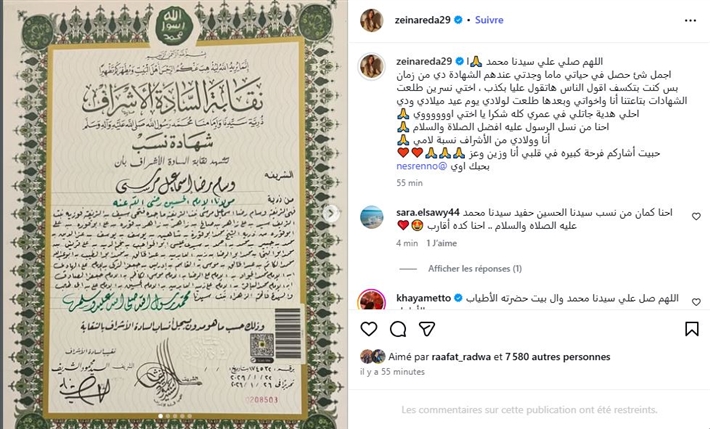 زينةوتابعت زينة: احنا من نسل الرسول عليه افضل الصلاة والسلام، أنا وولادي من الأشراف نسبة لأمي، حبيت أشاركم فرحة كبيره في قلبي أنا وزين وعز.