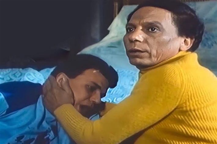الفنان عادل إمام وأحمد سلامة في مشهد من فيلم "المولد"وأشار إلى أنه في النهاية تم إلقاء مجسم بديل في المياه بدلًا منه، ومع صوت ارتطام المياه انتقلت الكاميرا مباشرة إلى عادل إمام، لينتهي المشهد دون تعريضه للخطر.