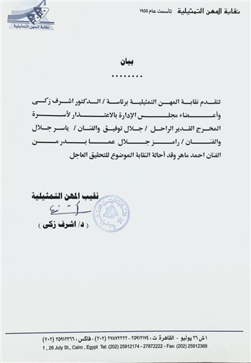 وجاء في نص البيان أن النقابة، برئاسة الدكتور أشرف زكي وأعضاء مجلس الإدارة، تتقدم بالاعتذار لأسرة المخرج القدير الراحل جلال توفيق، والفنان ياسر جلال والفنان رامز جلال، عما بدر من الفنان أحمد ماهر، وقد أحالت النقابة الموضوع للتحقيق العاجل.