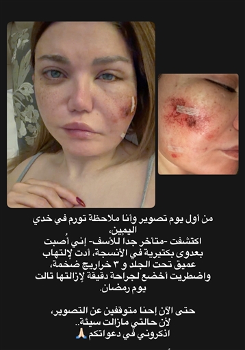 ونشرت ياسمين الخطيب عبر خاصية القصص القصيرة في حسابها على Instagram صورة لوجهها كشفت من خلالها عن إصابتها بعدوى بكتيرية.
