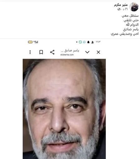 وكتب منير مكرم عبر حسابه الرسمى عبر موقع Facebook ناعيا الفنان ياسر صادق: "ستظل معى حتى نلتقى.. الدوام لله ياسر صادق أخى وصديقى عمري".