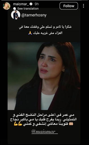 ونشر تامر حسني عبر خاصية القصص القصيرة في حسابه على Instagram صورة لمي عمر من المسلسل وكتب: "مي عمر في أعلى مراحل النضج الفني والتمثيلي ربنا يفرح قلبك يا مي بأكبر نجاح، قلوبنا معاكي انشفي وكملي".