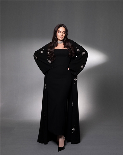 سيرين عبد النورارتدت سيرين عبد النور عباءة باللون الأسود من خامة "الكريب" مع تطريزات من الكريستالات على شكل وردة على الأكمام الواسعة، مع فستان أسود ضيق أسفلها.