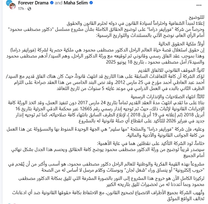 إعلاءً لمبدأ الشفافية واحتراماً لسيادة القانون في دوله تحترم القانون والحقوق، وحرصاً من شركة "فورايفر دراما" على توضيح الحقائق الكاملة بشأن مشروع مسلسل "دكتور مصطفى محمود" أمام الرأي العام، نوضح الآتي بالمستندات والتواريخ الرسمية:
