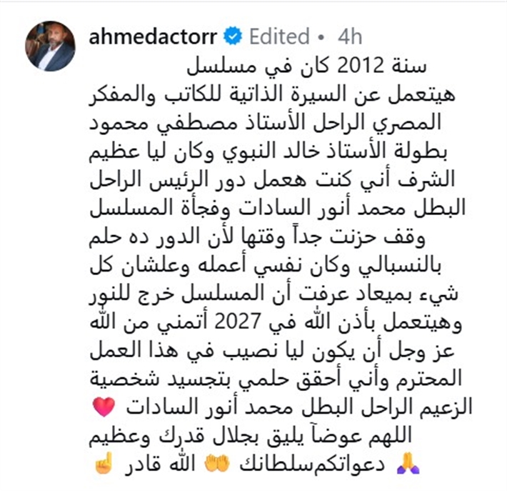 وتابع أحمد فهيم: "وعلشان كل شيء بميعاد عرفت أن المسلسل خرج للنور وهيتعمل بإذن الله في 2027 أتمني من الله عز وجل أن يكون ليا نصيب في هذا العمل المحترم وأني أحقق حلمي بتجسيد شخصية الزعيم الراحل البطل محمد أنور السادات اللهم عوض يليق بجلال قدرك وعظيم سلطانك الله قادر".