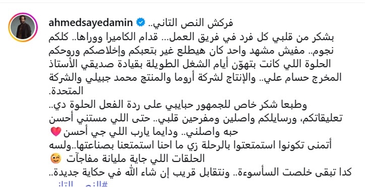 أبطال مسلسل "النص التاني"وتابع أحمد أمين: "وطبعا شكر خاص للجمهور حبايبي على ردة الفعل الحلوة دي.. تعليقاتكم، ورسايلكم واصلين ومفرحين قلبي.. حتى اللي مستني أحسن حبه واصلني.. ودايما يارب اللي جي أحسن، أتمنى تكونوا استمتعتوا بالرحلة زي ما احنا استمتعنا بصناعتها..ولسه الحلقات اللي جاية مليانة مفاجآت، كدا تبقى خلصت السأسوءة.. ونتقابل قريب إن شاء الله في حكاية جديدة".
