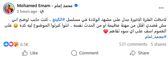 وكتب محمد إمام عبر صفحته الرسمية عبر حسابه بموقع Facebook: "لاحظت الفترة الاخيرة جدل على مشهد الولادة في مسلسل #الكينج .. كنت حابب اوضح اني مش قصدي اقلل من مهنة عظيمة او من الحدث نفسه .. انتوا كبرتوا الموضوع ليه كده، على العموم اسف على اي سوء تفاهم".