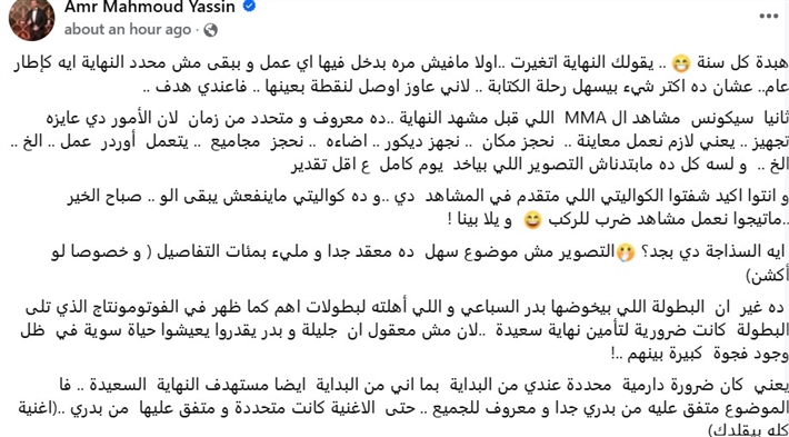 وكتب عمرو محمود ياسين عبر حسابه على Facebook: "هبدة كل سنة يقولك النهاية اتغيرت أولا مافيش مرة بدخل فيها أي عمل وببقى مش محدد النهاية ايه كإطار عام عشان ده أكتر شيء بيسهل رحلة الكتابة لأني عاوز أوصل لنقطة بعينها فعندي هدف".