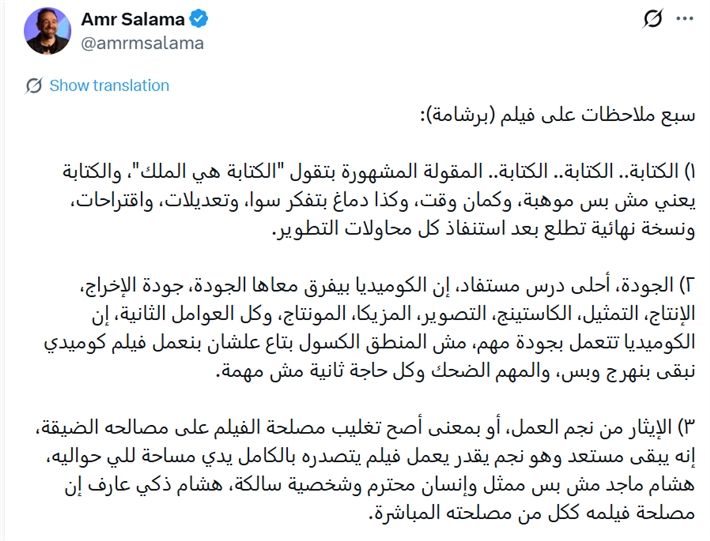 وكشف عمرو سلامة عن 7 ملاحظات في رأيه هي سبب نجاح الفيلم وكتب عبر حسابه بموقع X: