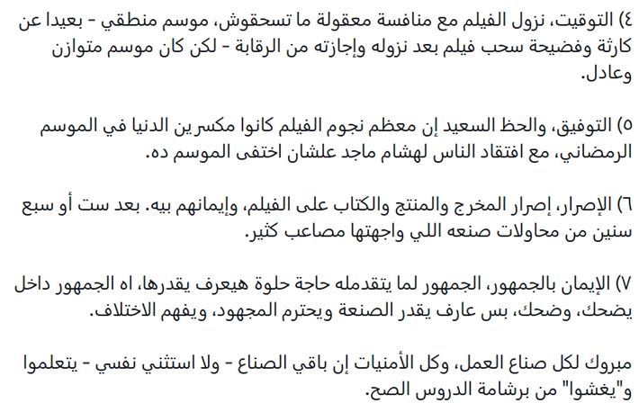 منشور عمرو سلامة4) التوقيت، نزول الفيلم مع منافسة معقولة ما تسحقوش، موسم منطقي - بعيدا عن كارثة وفضيحة سحب فيلم بعد نزوله وإجازته من الرقابة - لكن كان موسم متوازن وعادل.