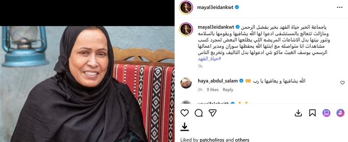 ونشرت مي العيدان صورة لحياة الفهد عبر حسابها على Instagram وكتبت: "ياجماعة الخير حياة الفهد بخير بفضل الرحمن ومازالت تتعالج بالمستشفى ادعوا لها الله يشفيها ويقومها بالسلامة وتنور بيتها بدل الإشاعات المريضة اللي يطلعها البعض لمجرد كسب مشاهدات".